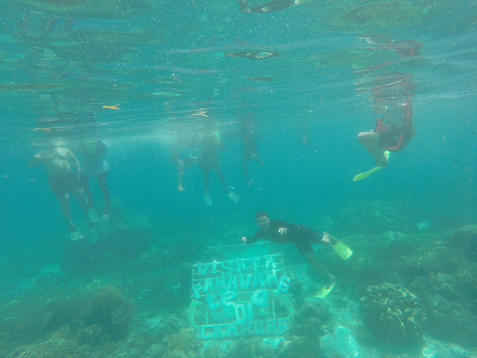 Ini Spot kedua snorkling, tulisannya "Wisata Pahawang Tea di Lampung". Ini juga jadi bahan objek foto sambil nyelem-nyelem cantik, di spot ini tetep terumbu karangnya cakep banget. Malah disini kita bisa liat budi daya terumbu karang gitu, ada pipa pipa paralon dan pot-pot yang isinya terumbu karang, banyaaaak banget, warna-warni dan cakep